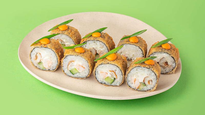 Состав: Угорь, креветка, сливочный сыр, огурец, темпурный кляр (темпурная мука, вода), панировочные сухари, зеленый лук, спайси соус, рис (рис, вода, заправка для риса), нори *Не забудьте заказать имбирь, васаби и соевый соус. Они не входят в стоимость заказа.