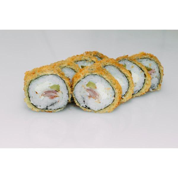Состав: Рис, нори, сыр, огурец, бекон, острый соус